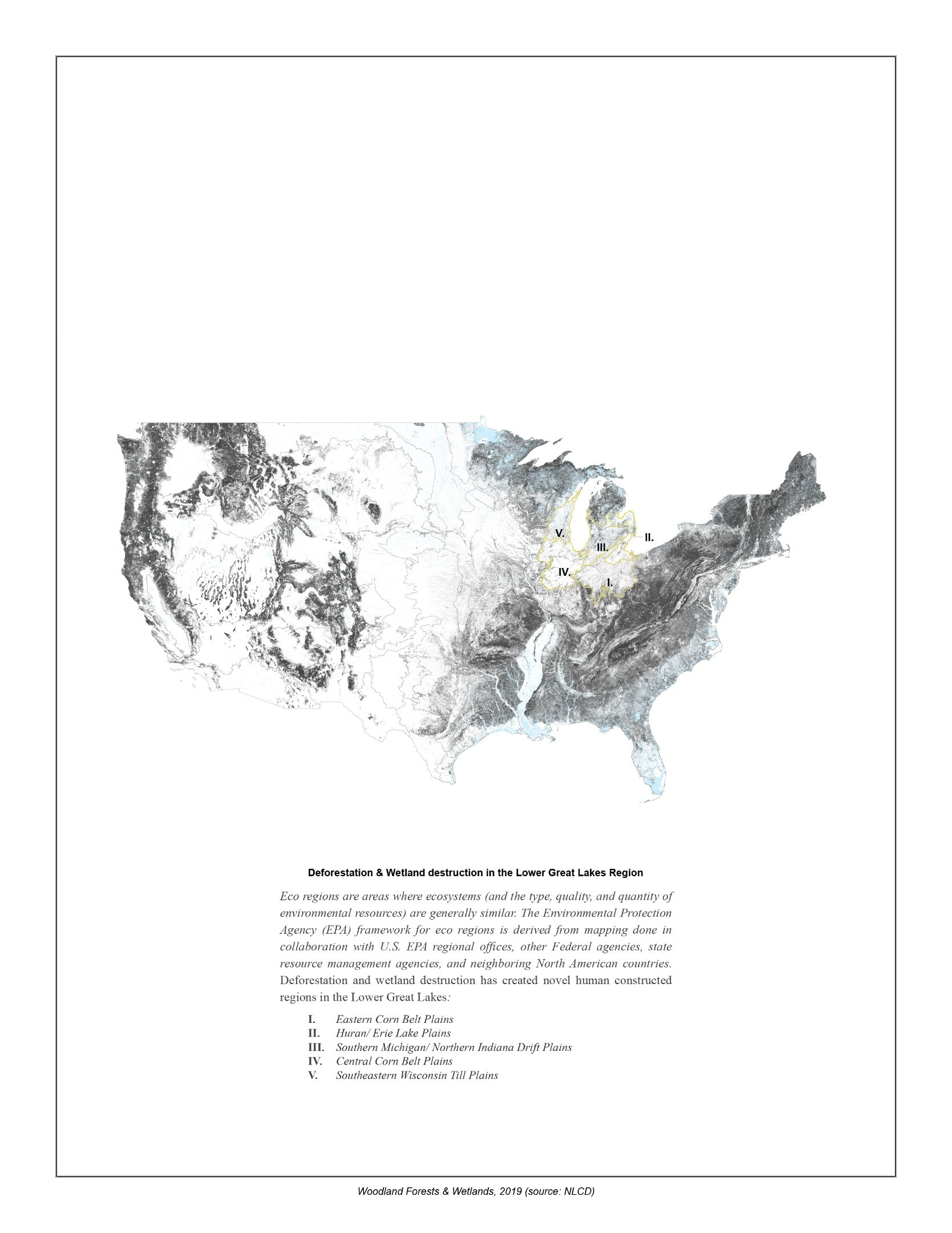 The result is a fragmented landscape with human settlement and infrastructure exporting significant quantities of sediment, chemical pollutants, and other externalities into waterways, the air and soil. In deforested and historically much wetter regions like the Lower Great Lakes Region, the landscape capacity to sustain diverse plant, animal, and aquatic species is struggling and shrinking.
