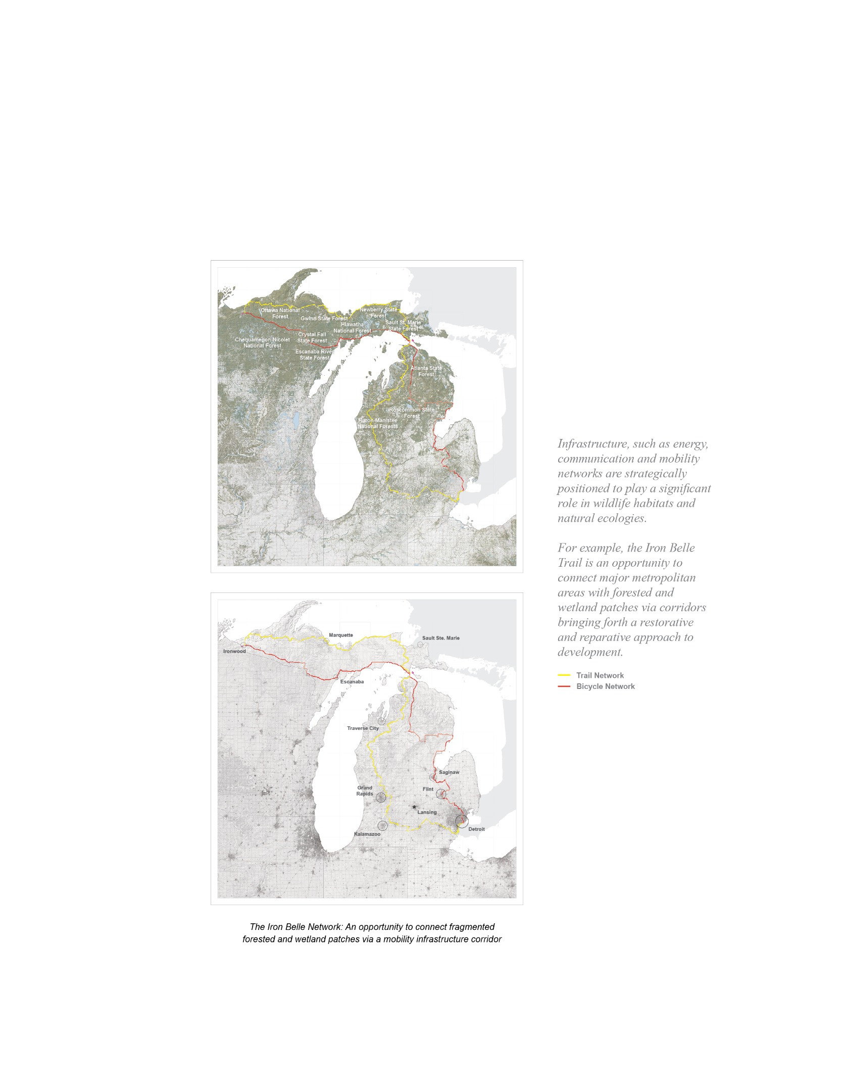 Regional mobility networks such as Michigan’s “Iron Belle Trail” exist in other parts of the world and are termed: “bicycle highways.” Bicycle highways and hiking corridors are non-invasive mobility networks and are able to provide access to parts of the landscape that are largely inaccessible via rail or road networks. Bicycle highways and hiking corridors can run along windbreaks. Bike highways can navigate alongside filter strips and vegetated ditches. Bike highways can weave in and out of riparian, wetland and other water buffers. In this way, the Iron Belle Trail” has potential to become a regional mobility network and a green and blue infrastructure. A vision that connects urban settlements and creates a new, diverse, and a mutually beneficial relationships with wildlife habitats and natural ecologies.